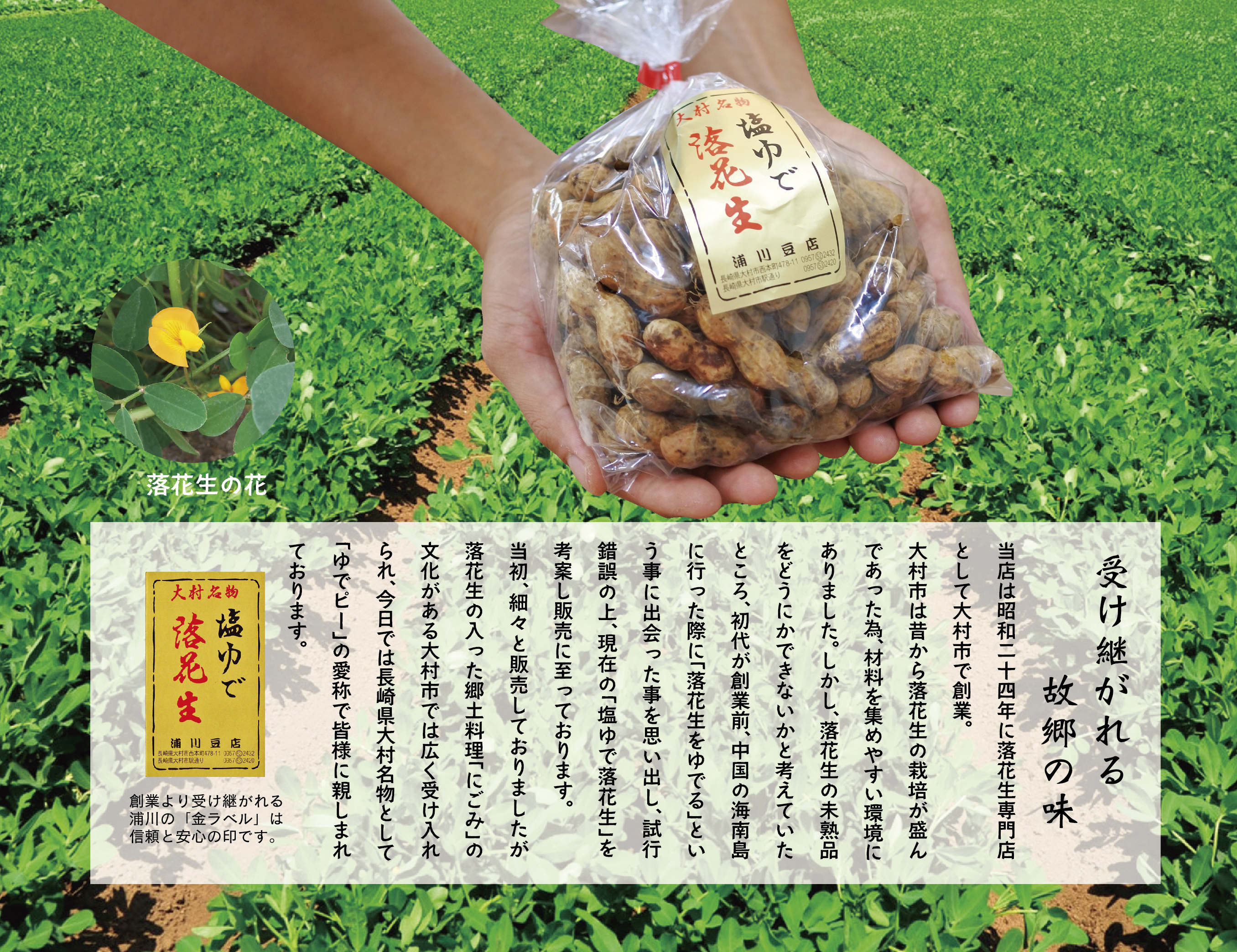 初代が塩ゆで落花生づくりを始めたのは戦後まもなくのとき。戦友を頼って落花生の栽培が盛んであった長崎県大村市に移り住んだことからはじまります。試行錯誤を繰り返し、本格的に販売を始めたのは1949年のこと。以来、大村市の落花生を集めて回り、落花生一筋に営業して参りました。「大村市で作る、対面で売る、できる範囲で営む。味を第一に考えればこれしかない。ふるさとの方達に受け入れていただける商品を作れば、それは全国のどこでも満足してもらえると思いますから。」→受け継がれる故郷の味